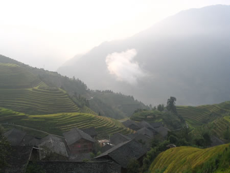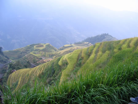 龍勝的梯田風(fēng)光乃世界又一大景觀,春夏秋冬其景觀各不相異.在這金秋時(shí)節(jié),整個(gè)梯田山上金黃的麥穗一片,形成一片浩瀚的海濤景色圖.經(jīng)過(guò)4個(gè)半的車程&1個(gè)鐘的攀越,終于將龍勝梯田秋之景一覽于腳下.