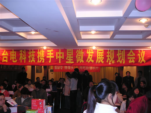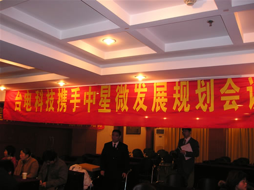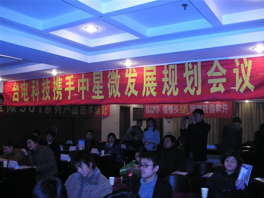 會議召開前奏,南昌分公司早早來到會場把“臺電攜手中星微發(fā)展規(guī)劃會議”的大橫幅掛在會場中間,搶占了至高點,高手風范。