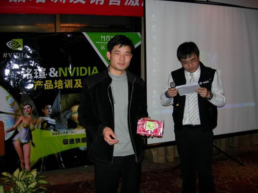 這次經(jīng)銷(xiāo)商會(huì)的互動(dòng)活動(dòng)也是相當(dāng)成功,抽獎(jiǎng)、有獎(jiǎng)問(wèn)答及現(xiàn)場(chǎng)拍賣(mài)一系列活動(dòng)使得現(xiàn)場(chǎng)氣氛十分熱烈。幸運(yùn)的經(jīng)銷(xiāo)商抽得銘瑄極光系列顯卡一張。NVIDIA侯宇濤先生為其頒獎(jiǎng)。