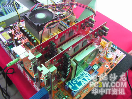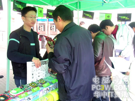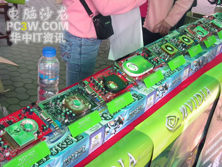 基于SM3.0、HDR以及SLI這三大顯示技術(shù)的GF6系顯卡產(chǎn)品擺滿了整個(gè)產(chǎn)品展示區(qū)的展臺(tái)。從入門級(jí)的6200TC直到最近被各大IT媒體所熱炒的6800GS,展示產(chǎn)品可以說(shuō)是琳瑯滿目。