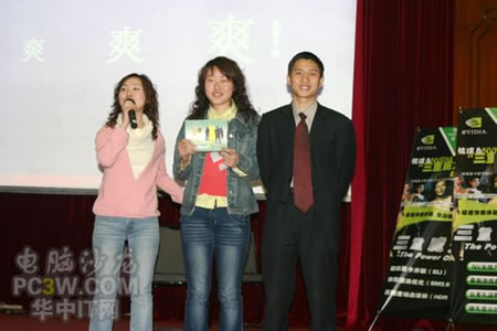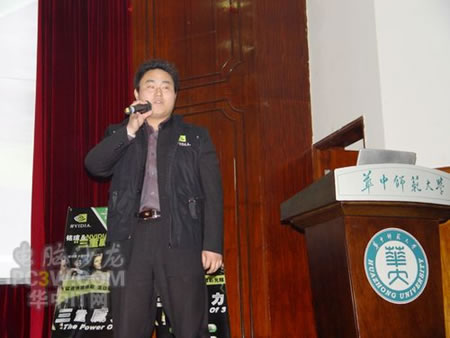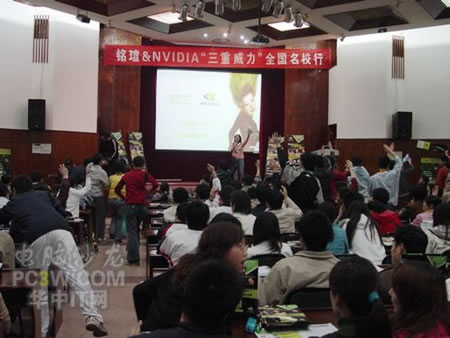 講座首先由商科集團(tuán)武漢分公司天行電腦的甘松先生發(fā)言,他首先詳細(xì)的向大家解釋了銘瑄NVIDIA“三重威力”的定義。并就“三重威力”的具體內(nèi)容SM3.0、HDR以及SLI逐一做了詳細(xì)的說(shuō)明。他生動(dòng)幽默的演講引來(lái)同學(xué)們的陣陣掌聲,會(huì)場(chǎng)氣氛相當(dāng)融洽。