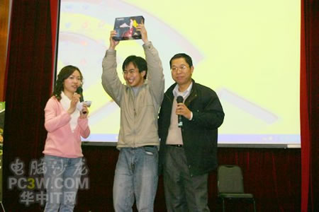 壓軸大獎(jiǎng)是由商科集團(tuán)武漢天行電腦提供的臺(tái)電超大彩屏MP4一個(gè),得主是位帥GG,運(yùn)氣真是不錯(cuò)!上臺(tái)領(lǐng)獎(jiǎng)時(shí)這位興奮的帥GG,激動(dòng)之下突然主動(dòng)曝光自己并不是華師的學(xué)生,而是武大學(xué)生路過華師看到這次活動(dòng)......這下可不得了,臺(tái)下華師的GGMM怎么能看著到自己學(xué)校門口的大獎(jiǎng)就這樣白白被拿走,還好這位帥GG也相當(dāng)大方,回答了主持人提的問題,并滿足了觀眾們的要求表演了小節(jié)目。