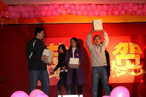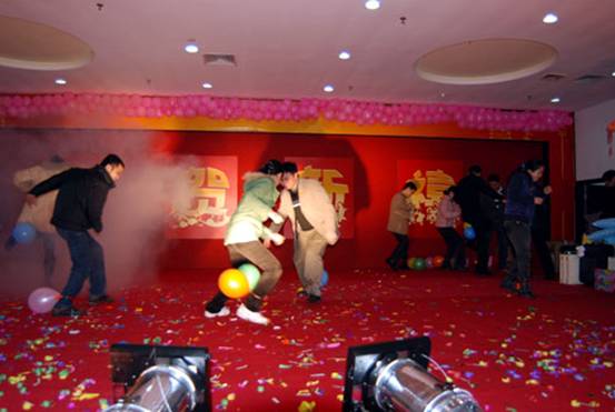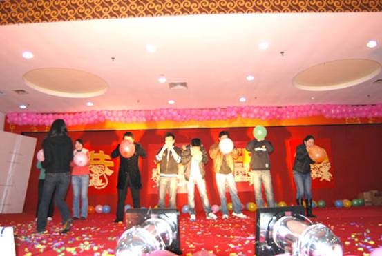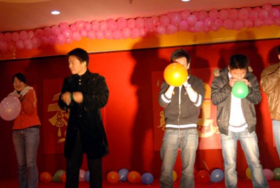 首先請(qǐng)出的是鼠年本命年的幸運(yùn)同事上臺(tái),他們將得到一份精美的禮品,郵票幸運(yùn)封。同時(shí)他們也要參加今天的第一個(gè)游戲節(jié)目,比賽吹氣球。比賽規(guī)則是規(guī)定的時(shí)間內(nèi),誰(shuí)把氣球吹爆的多,誰(shuí)就是冠軍。每位參賽者不僅可以得了一份價(jià)值不菲的禮物,獲勝冠軍還有特別的禮物領(lǐng)取。