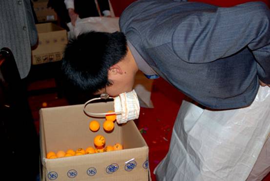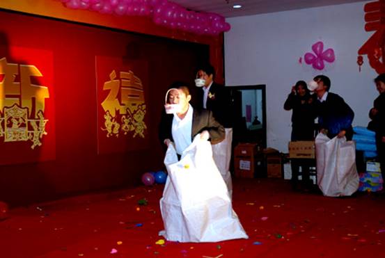 真正考驗(yàn)大家的時(shí)候到了,下一個(gè)游戲項(xiàng)目是運(yùn)球接力賽,主持人宣布每桌派出三名同事上臺(tái),根據(jù)規(guī)定必須用嘴咬住籃子,將小球從舞臺(tái)的一邊運(yùn)輸?shù)綄?duì)面一邊的椅子上,而且必須把自己裝進(jìn)布袋里前進(jìn),這個(gè)難度可真不小。