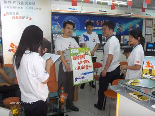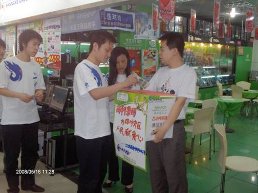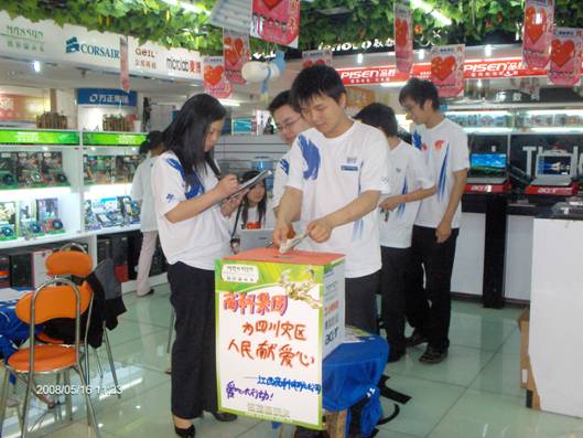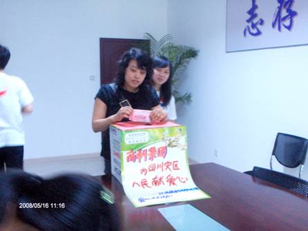 2008年5月12日下午2點(diǎn)58分,我國四川汶川地區(qū)發(fā)生了7.8級大地震.目前已經(jīng)造成造成多人死亡,現(xiàn)在有更多的人無家可歸。面對四川的百年不遇的災(zāi)情,商科人的心情萬分焦急和關(guān)注中!雖然我們力量十分有限,但是我們完全可以用自己能做的方式去盡一點(diǎn)力,表達(dá)一份愛心!在此,我們?nèi)w員工自發(fā)的進(jìn)行了向?yàn)?zāi)區(qū)獻(xiàn)愛心募捐活動。