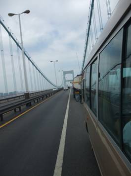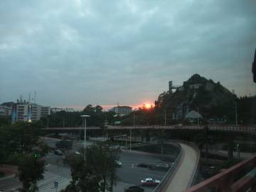 經(jīng)過整整九個多小時的長途跋涉,下午六點多,終于即將到達(dá)我們的第一站,在進(jìn)入市區(qū)的時候恰巧夕陽西下,一輪紅日慢慢隱沒與橋的那一頭,又一副壯美景觀呈現(xiàn)于眼前。。