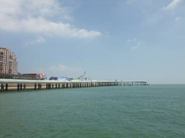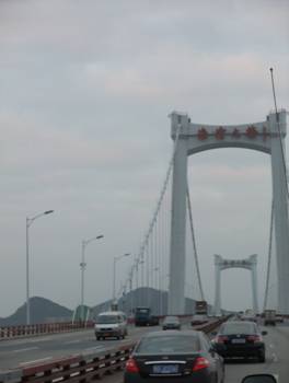 從導(dǎo)游宋小姐口中得知,海滄大橋乃是世界第二,亞洲第一的特大型三跨全漂浮鋼箱梁懸索橋,全長五千多米(嘿嘿,當(dāng)時沒記住詳細(xì)數(shù)據(jù),查資料得知全長5926.527米,主跨648米);大橋的索塔采用門式結(jié)構(gòu),橋柱各部結(jié)構(gòu)采用曲線造型為基調(diào)的設(shè)計構(gòu)思,型體上線條流暢,輕柔,使大橋本身也為了一座藝術(shù)精品。 遠(yuǎn)遠(yuǎn)望去,銀藍(lán)色的橋體與碧藍(lán)色的天空相輝映,似長虹如玉帶般橫臥在粼粼的海面上。一條條平行鋼絲索股,掛在門式索塔上,舉目望去行駛的汽車仿佛飛翔在藍(lán)天碧海中,縱橫交錯,真是美不勝收的畫卷。