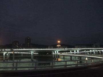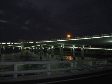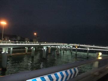 當(dāng)旅行巴士進(jìn)入市區(qū)行至環(huán)島路西段時,一座壯美獨特的大橋又躍然于眼前。此時,正值華燈初上,遠(yuǎn)遠(yuǎn)看去只見一長排橋墩呈橢圓型立于水中,空中橋身則為流暢的弧線形,橋上燈火輝煌,橋下波光蕩漾,就如同一條騰出水面的白龍,強(qiáng)烈地震撼著我們的視覺,原來這就是著名的“演武大橋”。