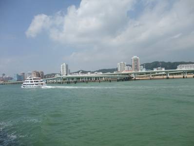 金門島游輪合影 次日,乘坐游輪環(huán)游小金門島再次經(jīng)過演武大橋,立于船頭遙望廈門市區(qū),只見大橋迎面聳立海上,與夜景絕然不同,她與岸同高, 呈S形的路段環(huán)繞著廈門大學(xué)的海景房,流線型的梁體緩緩延伸,波浪似地起伏著;遠(yuǎn)遠(yuǎn)看去,如長龍臥波,欲騰空而起,細(xì)看時 又似展翅飛翔的白鷺,躍出水面的白鰭豚,簡捷流暢的線條,精美靈動的造型,給人以強(qiáng)烈的視覺美感。