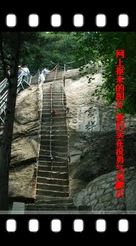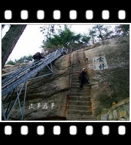 大約一小時后,我跟O同學爬上金鎖關,在喊我們買手電的人面前驕傲的掏出我們的裝備。前路沒了引路燈,風險恐懼倍增,正擔心后面的團員,O同學說“不用擔心,成年人會知道要買手電的,且路上人那么多,相互會照應呀”。于是,再次上路,行至云梯,我們膽怯了,直立的石梯,3條鐵索,完全是沒有安全繩的純攀巖,放棄吧。幸好還有個相對容易的鐵梯,轉去鐵梯,只是有扶手的鐵梯是供人下山用的,窄梯屬單行線,只能等山上的人下完,才能上,否則必然極度危險。我倆是沒有耐性的人,等了3分鐘,又跑回石梯。抓上鐵索,蹬上石梯,沒來得及后悔,已沒了力氣,O同學看我不動了,喊我退下來。我怎甘心退下來,喊了下旁邊的帥哥,“我沒力氣了,你等等我,幫幫我”。帥哥空了一只手,扶了我一把,突然讓我有氣力調整姿勢了,原來剛才因為害怕抓緊鐵索,試圖用手臂力量征服云梯是錯誤的,既然是梯,就該用腿蹬上去,喊著“我一定要爬上去”,調整好姿勢,謝過帥哥,輕松的爬了上來,東峰頂即在眼前,云梯之上的那刻,狂喊狂喜。可低頭,莫放棄,終會獲得。