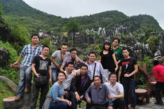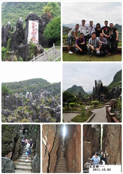當(dāng)天下午三點(diǎn)多我們又來(lái)到玉石林景區(qū),它之所以叫玉石林是因?yàn)樯缴系氖^屬于玉白色,不同于昆明的花崗巖石林;一路行去,處處石林矗立、石芽裸露、奇峰突兀、石筍石柱狹縫密布;玉石林的小路涉及很科學(xué),在不大的景區(qū)蜿蜒穿插,交錯(cuò)疊行,可以使游人充分運(yùn)動(dòng),又能從不同角度去欣賞玉石林的特色;大家逢路必走,有坡必上,特別是在“一線天”,累的大汗淋漓,較上午的游姑婆山累多了。。。