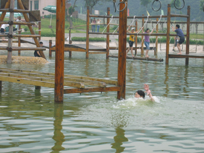 有個“仙女”居然雙腳“離水”三尺,踩著繩梯悠閑自得的走來走去。
