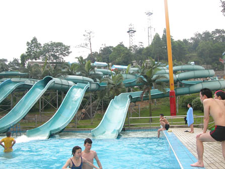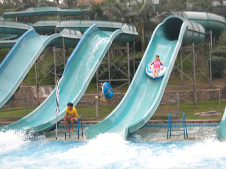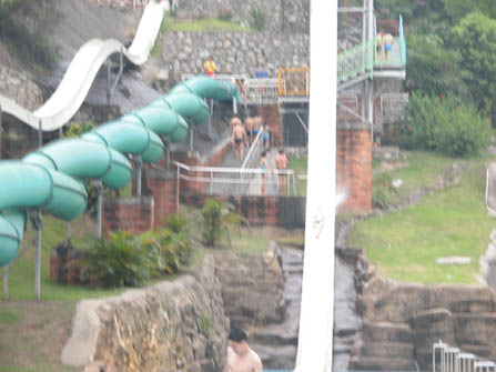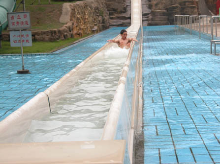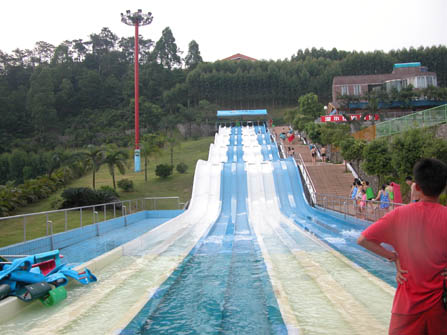 據(jù)不可靠的資料記載,此滑水道有七層樓那么高,也就是大概在25米左右,最高出和接地處據(jù)本人不完全的統(tǒng)計(jì)是成110度角,當(dāng)你站到最頂點(diǎn)的高臺(tái)上的時(shí)候,要往下滑的的時(shí)候需具有大智大勇的氣魄; 大智,站在上面的時(shí)候,千萬(wàn)的不要往下看看有多高,不然就肯定把你滑下去的決心減低到百分零點(diǎn)幾。(呵呵,說(shuō)得有點(diǎn)夸張了,別給我嚇到),大勇,其實(shí)就是懵懵懂懂的沖下去,根本就不知道自己干了些什么之類(lèi)的。