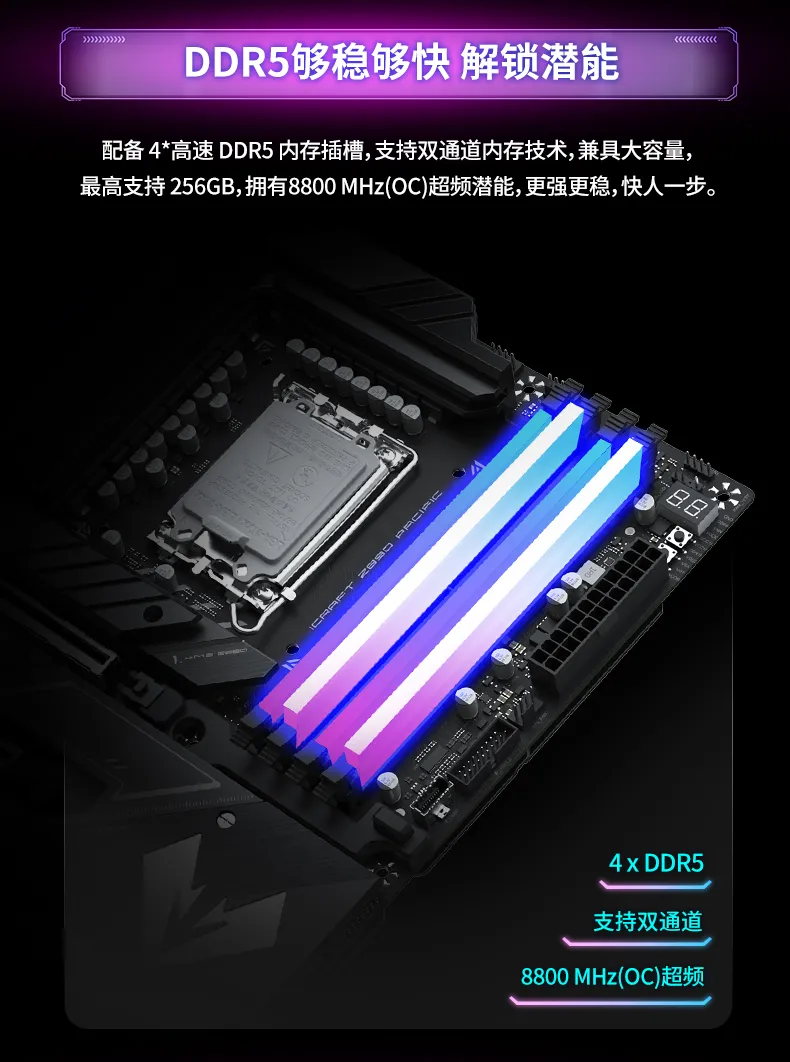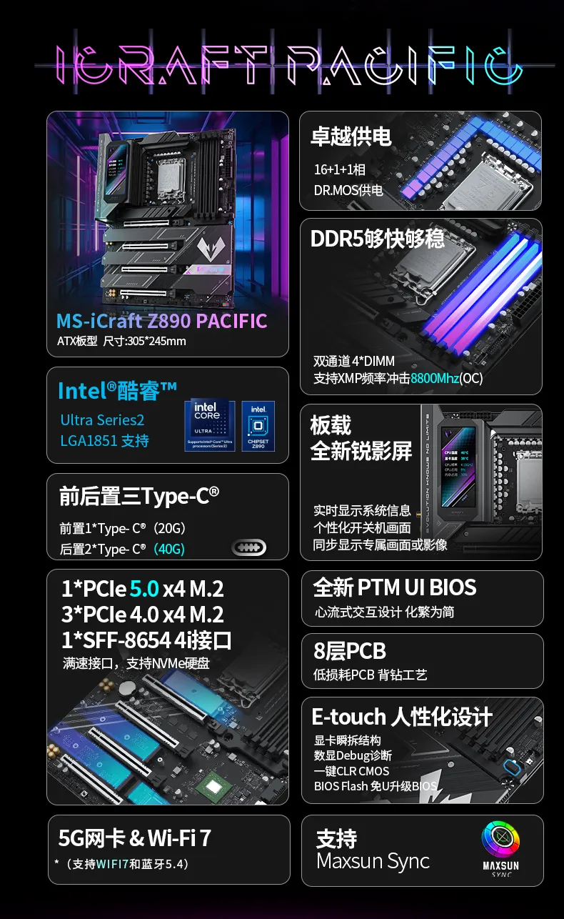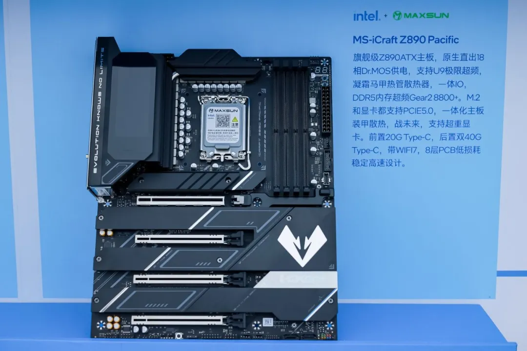 其中,在活動現(xiàn)場也有展出的MS-iCraft Z890 Pacific憑借出色的配置獲得了相當高的關(guān)注度。16+1+1相DR.MOS供電的強悍配置,充分發(fā)揮CPU潛能,配備4*高速DDR5內(nèi)存插槽,超頻沖擊8800MHz,8層服務(wù)器級PCB有效降低信號損耗、增強信號完整性、助力DDR5高速傳輸。