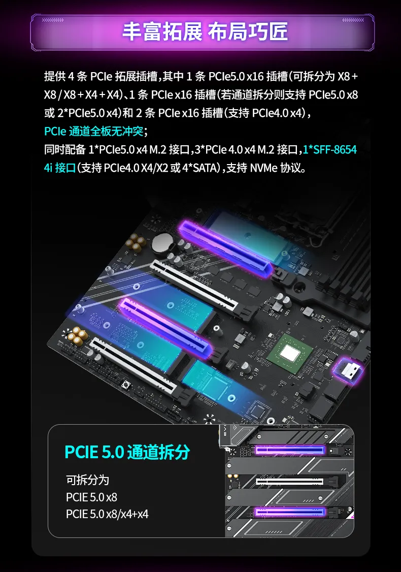 拓展方面,MS-iCraft Z890 Pacific提供前后置三Type-C,其中2個后置Type-C接口達到40G理論傳輸速度,數(shù)據(jù)傳輸速度進一步升級!拓展方面,該主板提供4條PCIe拓展插槽,其中1條PCIe5.0 x16插槽可拆分為X8+X8/X8+X4+X4,PCIe通道全板無沖突,配備4個M.2硬盤接口和1個SFF-8654 4i接口(支持PCIe4.0 X4/X2或4*SATA)。