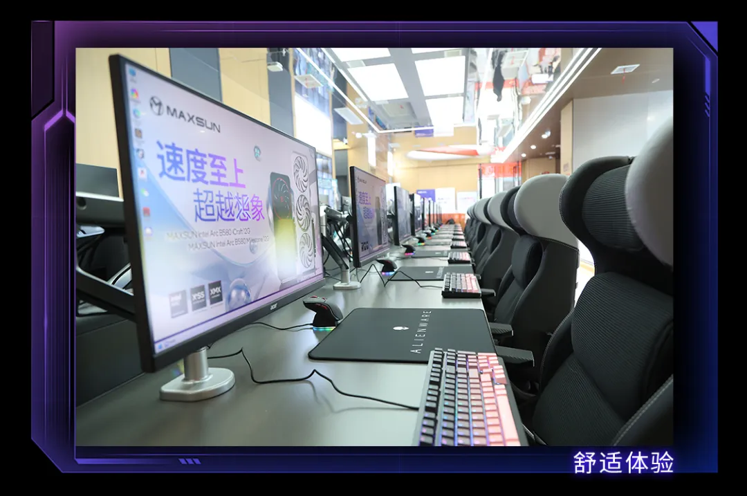 電競(jìng)館劃分有單人房、雙人房、三人房、八人房等多種競(jìng)技區(qū),全場(chǎng)共99臺(tái)機(jī)器,采用銘瑄板卡,包括B760系列主板、Z890系列主板和最新推出的銘瑄Intel Arc B580顯卡。電競(jìng)館緊跟市場(chǎng)潮流,選擇時(shí)興的“3I平臺(tái)”(英特爾CPU+英特爾芯片組+英特爾GPU)為玩家提供強(qiáng)悍的性能加持。其中,MS-Challenger Z890M主板 x MAXSUN Intel Arc B580 Milestone 12G x 英特爾®酷睿™Ultra 200S系列處理器的超強(qiáng)搭配可謂最為亮眼。
