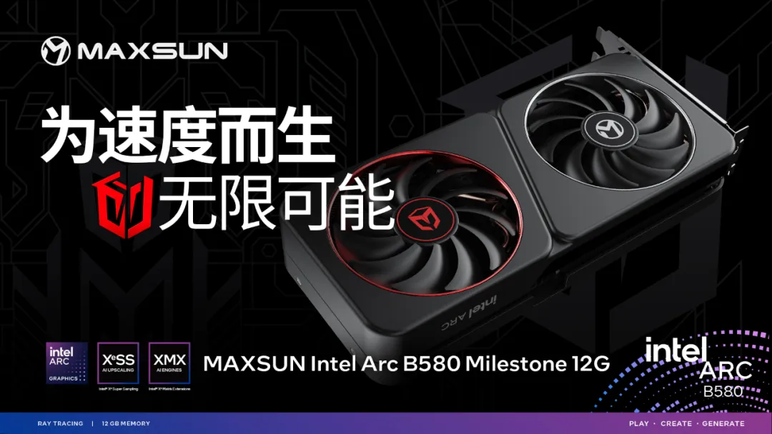 MAXSUN Intel Arc B580 Milestone 12G顯卡,為速度而生,無(wú)論是性能、散熱、外觀上都有著出色表現(xiàn)。12GB超大顯存,即使在高負(fù)載游戲中都能輕松應(yīng)對(duì)。