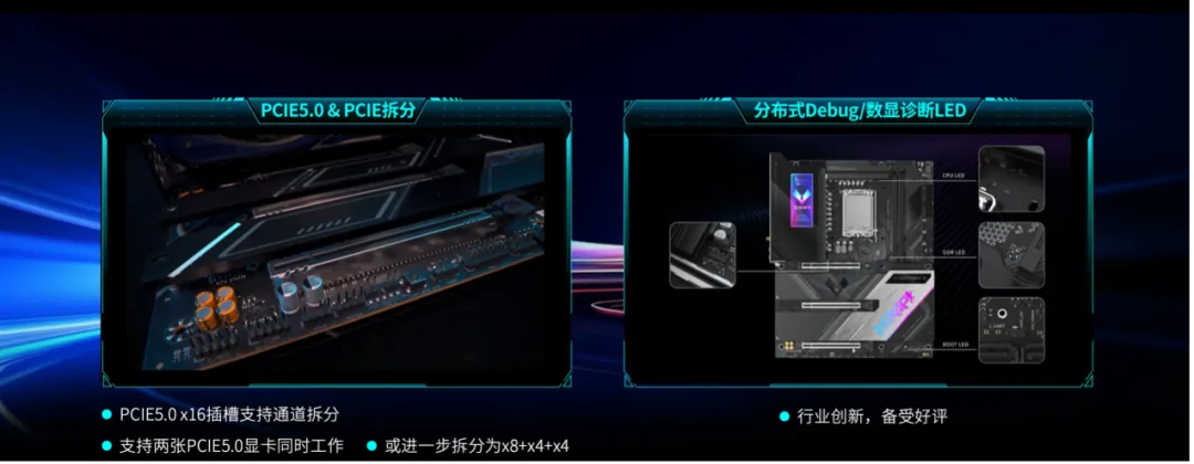 在人性化設(shè)計(jì)方面,800系主板也優(yōu)化了各種細(xì)節(jié),力求為用戶呈現(xiàn)更優(yōu)質(zhì)便捷的DIY裝機(jī)體驗(yàn)。PCIe快拆系統(tǒng),一鍵拆裝,輕松裝卸;Wi-Fi天線快裝接口,卡扣式設(shè)計(jì),安裝簡(jiǎn)便;分布式Debug燈和數(shù)顯診斷LED,輕松找到故障位置;PCIe5.0&PCIe拆分,不僅支持兩張顯卡同時(shí)工作,還可以支持三顯卡使用。