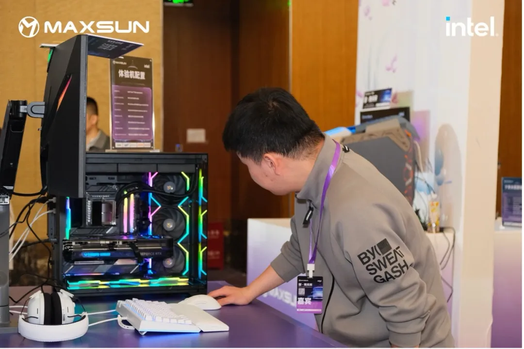 在新品發(fā)布結(jié)束后,嘉賓們自由享受茶歇或到展示區(qū)感受800系新品主板的強(qiáng)大性能和出眾外觀。現(xiàn)場(chǎng)除了展示800系主板單品外,還有多部搭載Intel® Core™ Ultra processors處理器的游戲電腦供嘉賓體驗(yàn)。