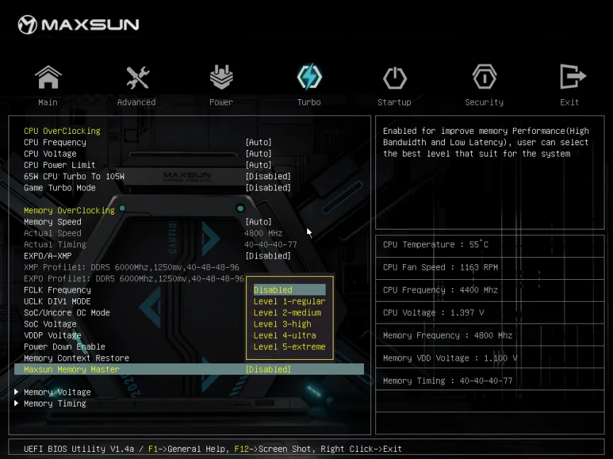 對于許多用戶而言,內存超頻可能仍然是一個復雜的話題。銘瑄全新推出MMM模式,幫助用戶快速實現輕松超頻。針對不同的用戶需求,MMM模式提供Level 1-5共5個檔位,預設內存優(yōu)化配置,用戶直接選擇則可套用。5個檔位里,檔位越高,性能提升越明顯,但需注意的是同時對硬件體質要求也更高,用戶可根據自身實際情況操作,選擇最適合自身需求的內存配置。