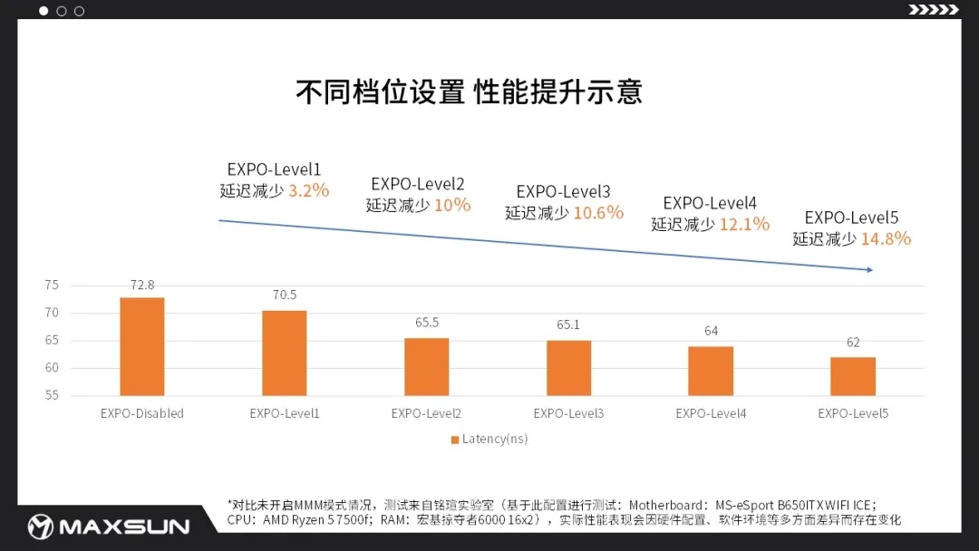 據銘瑄實驗室實測,開啟MMM模式Level5后對比未開啟MMM模式,讀寫性能提升9.1%,延遲減少14.8%,性能提升表現卓越(注:實際性能表現因硬件配置、軟件環(huán)境等多方面差異而存在變化,因架構差異原因,銳龍8000系列不支持該功能)。