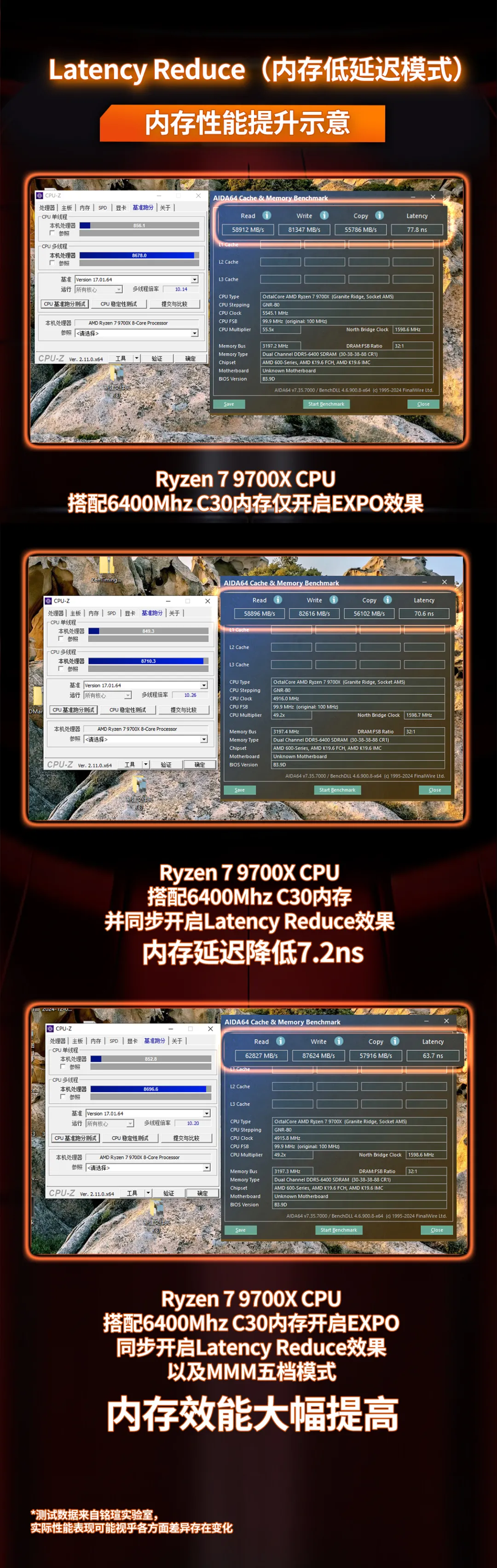 針對Ryzen 9000系CPU內存延遲提高,銘瑄專門開發(fā)新功能幫助提升系統效能——Latency Reduce(內存低延遲模式)。該功能主要針對內存延遲進行優(yōu)化,開啟后將進一步提升內存性能,另外此功能還可搭配MMM銘瑄內存大師同時使用,以達成更高內存效能。